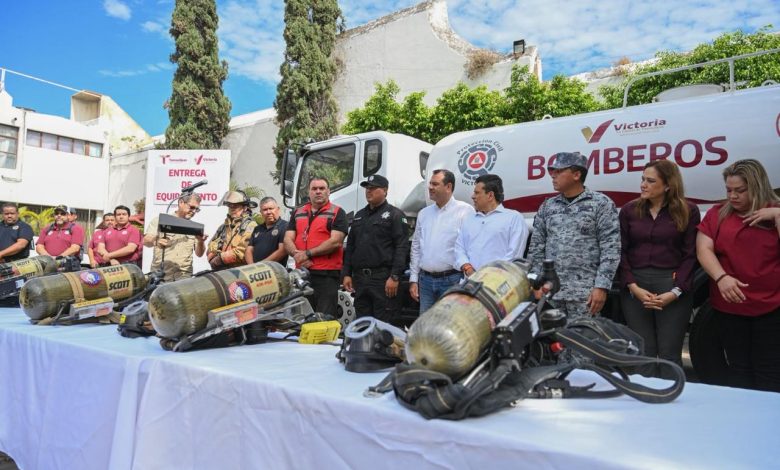 El presidente municipal de Victoria, Eduardo Gattás Báez, entregó este día equipo especializado y camión cisterna a la Coordinación de Protección Civil y Bomberos para la atención rápida y eficiente de emergencias o siniestros que pongan en riesgo a la población.